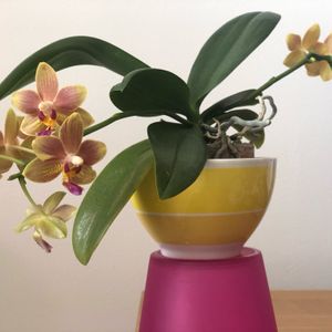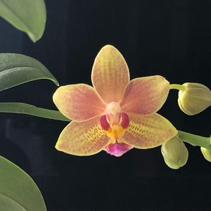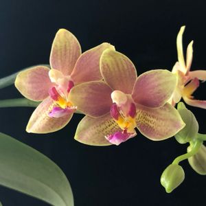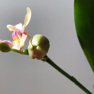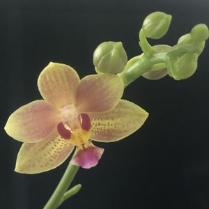 ミニ胡蝶蘭💚💛💖 品種名不明(みどりちゃん) 2本目の花茎に3輪目が咲いています♪ 蕾は緑色💚 🏷金曜日の蕾たち