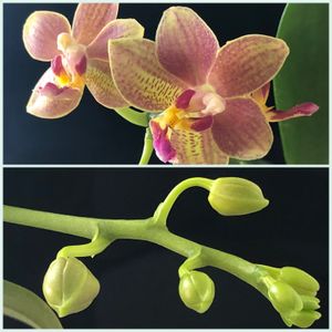 🏷金曜日の蕾たち 8月から一輪ずつ咲いているミニ胡蝶蘭 (愛称:みどりちゃん) 左上)1月に開花した2輪。 右上)蕾3個。 下)花茎もう1本出ています。