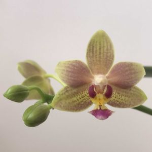 💚ミニ胡蝶蘭(みどりちゃん)💚 蕾ほころぶ✨ 8月、父の葬儀から帰ると咲いていたみどりちゃん。 花茎の先に一輪。 枯れるとまた蕾を出して2輪目(開花中)を咲かせ、 分岐して今度は蕾2つ。
