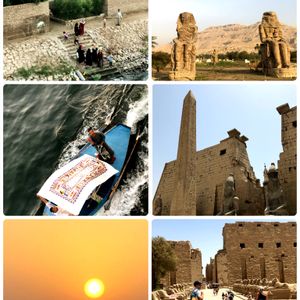 番外編-旅の続きです。 左上-ナイル川流域に住む人々 裸足の子供達が遊び幸せそう、、 左中-大きい船にロープを繋げ(ある意味命掛け?) テーブルクロスやバスタオルを船上の客達に売る商人。 船上のヨーロッパ人達が値段交渉し話が纏まると船に商品を上手に投げて上手にタオルを広げてお金を受け取る。 2€は見るだけ(笑) 5€でバスタオル売り買い成立👏 暗くなっても船に張り付いて何時間も売り続ける。 どうやって帰るのかな〜🤔 左下-ナイル川に沈む夕陽 右上-大家の谷、入口の巨像 風が吹くと鳴いたと言われたけれど、近年、隙間が埋められ、 鳴かなくなったらしい。 右中-ルクソール神殿🏛1本になっちゃったオベリスク。 ナポリタンが対である1本をフランス🇫🇷に持ち帰ちゃったヤツ、 パリ・コンコルド広場で台に乗せもっと大きく見える。 去年から今年、修復で金が施され綺麗になった。 エジプト考古学者ザヒ氏が返せ〜と言ってる🙄 右下-カルナック神殿🏛 広い。。トイレが遠い。。🥶(笑) 灼熱の太陽下🌞お腹を壊し水を飲むのも怖い🤬 冷汗を流しながら苦しんだ訪問は忘れられない🥵