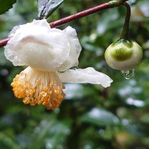 白いチャノキの花の蕾に水滴が光って綺麗です♡🌿 ツバキ科 ツバキ属 🏷素敵な水曜日 🏷白い水曜日♡ 🏷水滴の水曜日