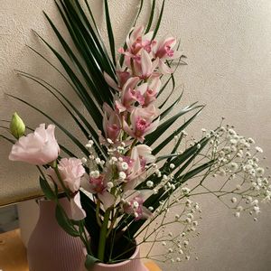 寝室に生花💐 シンビジウムと大きな葉が298と安かったので、トルコキキョウと合わせました ちなみに後ろの大きな葉は なんて言うのですか?🙄🙄🙄🙄