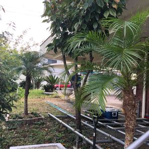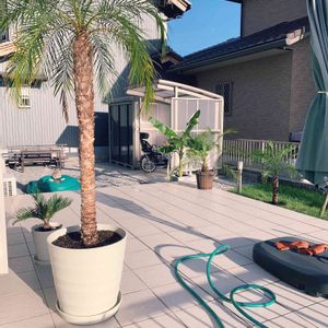 こんにちは。 2階からの写真です。 庭にフェニックスロベレニーとココスヤシを地植えしています。 もう少し鉢植えのヤシを増やしたいと思っています。計画では^_^