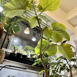 ウンベラータ😊大きな葉っぱを下から眺めるのが好きです〜😊奥はシャレおじブラックダンディーのフィカスバーガンディーさん😊オマケ