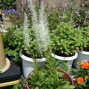 手前の白いお花です。6月に咲いているのを見かけました。宿根草っぽいんだけど…