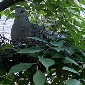 初めての事件です。エゴノキ ピンクチャイムの花がもうそろそろ咲いてるかなあ と顔を上げてみたら、 なんとキジバトちゃんが巣を作ってました😍 卵を温めているのかな。