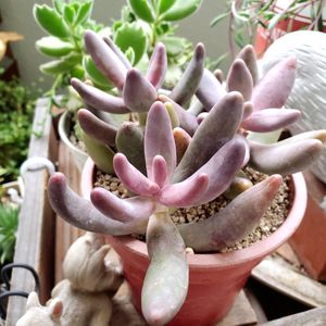 6日、ムッチリぷくぷくの日参加します😁 これも新入りさん 🍂キャンディグレープ パキセダム属 別名 🍂ガンゾウとも呼ばれる多肉 薄紫の太い棍棒型の葉が不規則に出るセダムハイブリッド系 葉挿しのやりがいがある太めの葉 紫麗殿のような色なのに、紅葉するとオレンジ色🍁なんだって😁 まだまだ知らない多肉出てきます