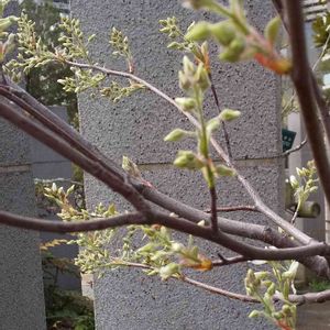 新しい街の公園に見たことのない木に綺麗な新芽が出ていました。 若葉が白い綿毛に覆われる落葉低木。 花弁の細い白い花が咲き、果実は紫黒色に熟します。 という標識がついていました。 時々見に来ようと思います。