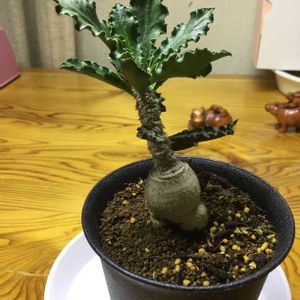 ぷっくりした塊根に五頭の枝が伸びてシワのある緑と紫の葉っぱ。 オベサの実生以外に初のユーフォルビア。 まだまだ眠るつもりはないみたいです。