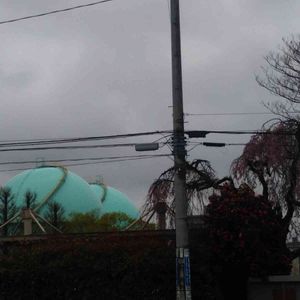 ガスタンクと枝垂れ桜🌸 本日雨二日目 満開から4日で散り始めてる😢