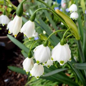 前出の、スノーフレーク・グレビティージャイアントです😊 スズランスイセンとも呼ばれますが、スズランでもスイセンでもない、スイセンの近縁の植物です(*^^*) スノードロップと名前が似ているので混同されたりしますが、全く違う植物で、白の花弁で弁先に緑のスポットがあり春に咲くというところは似てなくもないですが、大きさからしてかなり違いますよね。 スノードロップは、日本の気候がちょっと辛いようですが、 このスノーフレークは、大変に育てやすい植物で、放任でも良く咲くし、スイセン以上に丈夫かも~🎶