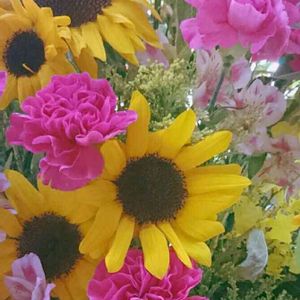 月に1度の通院帰り、必ず寄る花屋さんがあります💕 切り花も苗もとっても格安なので、自分へのご褒美に買いました。 デルフィニウムの濃い青に合わせて向日葵はレモンイエローに😊 正面よりもこの角度が綺麗な気がして、、、✨