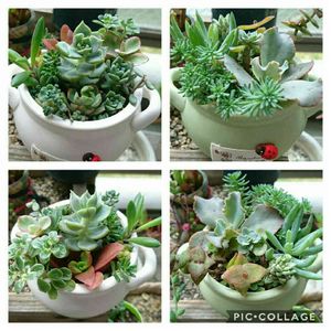 記録用💡 おはようございます。 10日程前に作った寄せ植え☺ 左側は友達へのプレゼント🎁 しわしわが取れて綺麗な姿になったのでそろそろ渡そうかな💕 *白牡丹 *紅日傘 *ルビーネックレス *黄麗 *火祭 *雅楽の舞 *プロリフェラ *セダム3種 右側はGWに狩った多肉寄せ植え。 みんな順調に育ってます👍 樹氷だけがまだ心配😅