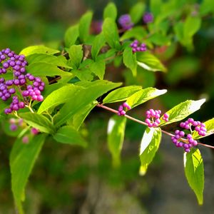 【コムラサキシキブ】 小紫式部 クマツヅラ科 初夏から晩秋へと 野趣あふれる 和の美しさと風情を 魅せられて…。 続投いたしました 枝が弧を描くように伸び 淡い桃色の花は繊細な 雰囲気に 秋晴れに紅紫の実をたわわに 庭に葉との饗宴 紫の彩りを添えて。