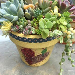 こんにちは〜〜😊 去年から、通りかかりの顔見知りのおばさまから、何でも良いので寄せ植え作って欲しいと言われていたので、どうせあげるならと鉢から作って寄せてみました〜💖 前に、オフ会の景品でも作ったハート♥️リメ鉢にしてみました。 喜んでもらえると良いなぁ〜〜✨✨