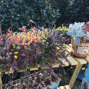 おはようございます〜〜🤗 久しぶりの投稿です💦 室内で、多肉を飾る為に買った棚が父に何年も占領されていたのを、やっとこ片付けてもらってペイント出来たので、外にデビューしました❣️ それにしても、寒い中でもルビネはめちゃ元気だし、花も咲いてるよん💖💖