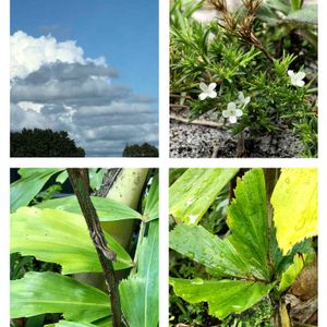 ⬅️重なっている雲 ➡️2ミリほどの小さなお花 曇っているのでいつもより良く撮れました ⬇️クジャクヤシの鉢植え 左にミニ🦎