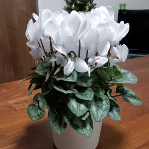 真っ白なシクラメン、お迎えしました。底面給水鉢に入ってました。底面給水鉢は初めてです。そのまま飾れて、植え替えしなくてもよいので楽ですね。長く咲いてくれますように😊