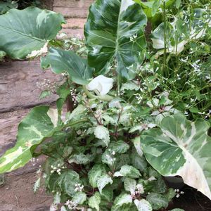 斑入り葉のコラボ🎶 ✨✨斑入りクワズイモ✨✨ ✨✨斑入りジュズサンゴ絣✨✨ 鉢の中 クワズイモの両側に ジュズサンゴ絣(かすり)を入れています🎶 珊瑚は見えませんが 優しい色の珊瑚です🔴✨