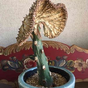 昨日、あしかがフラワーパークよりお連れしたガガ様フェルニア 交配種です! 咲き終わりの花がいくつかついています。色は地味ですが、全体に突起がありキモかわです💕