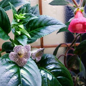 シンニンギア グッタータとゲスネリアsp.が次々咲いています。 置き場・暖房のある居間 3月11日だなあと思いながらも 晴れて暖かいので今シーズン枯らせた植物の処分や、山野草を車庫から外の軒下に移動したり、バラの鉢植えの雑草が引っこ抜けず仕方なく植え替えたりしています。