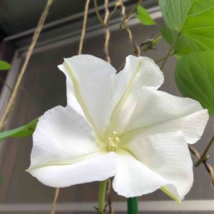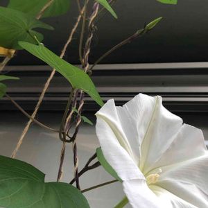純白のゆうがおです。 とても大きな花で10センチほどもあります。 ニョキニョキ伸びて2階の窓まで届いています。つぼみがまだたくさんついています。 ピンクの方は花が小さかったですけれど、こちらは大きく開いてとても綺麗です。