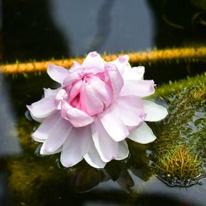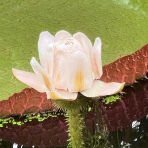 「オオオニバス」の開花 学名→Victoria(温室内です) 1日目は白色 2日目はピンク 夜間に咲く 午前10時30分頃、何度も来ていますが、初めて出会えたです 咲くやこの花館 5/23