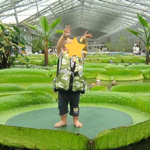 掛川花鳥園のオオオニバス🌱 息子が乗ってるバージョン✨ 小さい船で、係のお兄さんたちが運んでくれます。 絶対泣くと思ったのに、元気に手を振ってくれました 息子の成長に感動💕