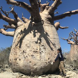 バオバブグランディデエリ。 樹皮に空いてる穴は、現地の方があけたもの。これに足をかけて登って実を獲ったり枝を切って家畜に与える。落書きはマナーのない観光客によるものなんだってさ…現地の方もバオバブを崇めて幹に絵を描いたりするんだけど、それとは根本的に違う。