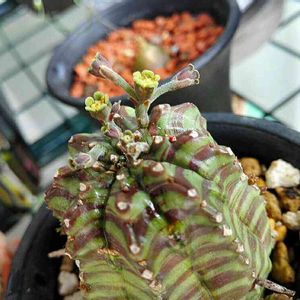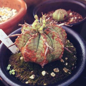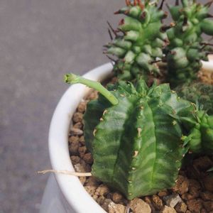 子吹きバリダ。子吹きという割にひとつしか子吹きしなくて、しかもなかなか成長してくれない。ただし、親株の方は、順調に成長してるみたい……なんだけど、バリダというからには枝を伸ばすかと思いきや、まるでオベサみたいに中心部に花を咲かせてます。去年の夏ごろは枝を伸ばしてその先端に花を咲かせていたけど、秋、そして今回はご覧の通り。かと思うと、画面真ん中奥みたいに枝が伸びて花が咲いてる部分も。 花の咲かせ方がいまいちわからない謎バリダ。