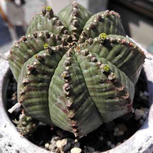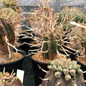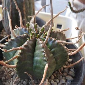 ユーフォルビア、バリダ。 地味~に花が咲いている。これまでは腕(刺)が伸びてから、その先端に花が咲いていたと思うんだけど? いや、同時だったかな? 去年の写真と比べて見ないと。