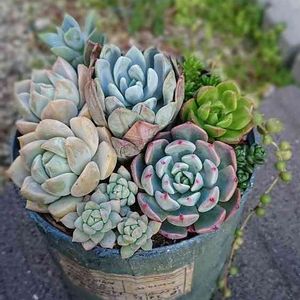 グリーンマルシェ横浜で購入した苗を同じグリーンマルシェで購入したリメ缶に植えてみました! 根がなかなか出なくてしわっしわの立田さん。 左の苗と、右斜め下の苗の名前分かれば教えて頂きたいですー!