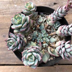 おはようございます👋😃 去年の秋にみちのすけちゃんちから嫁に来た多肉ちゃん達のその後の📸です🎶 あれからずいぶん大きくなって何回かチョンパして他の鉢へ引っ越した子もいますが最初の鉢に居る子はこんな感じです😊 昨日みちのすけちゃんのpicで虹の玉の斑入りがオーロラだと 今更ですが教えて貰いました💦 確認して納得です😅