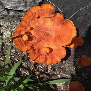 昨日のびっくりポン① せせらぎ公園のある せきれいの道の古い桜の木の下に 濃いオレンジ色の ヒイロタケ🍄(緋色茸)を見つけました いつも通っているのに初めて見ました (@_@;)