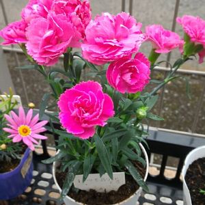 💠カーネーション プリティローズ💠上↑ 💠なでしこ スーパーパフェ💠下↓ カーネーションは、新聞屋さんに貰いました🤭 なでしこは、冬越し組❄️です🎵 ダイアンサスという名前でも有り、お花💠は大輪(約6cm)です☺ お花💠の数は大体120個位有り、株の大きさは70cm位有ります😲⚠️ マーガレットより大きな、大株主です‼️ まだ蕾が沢山あるので、もっさもっさになりそうです🎶💮