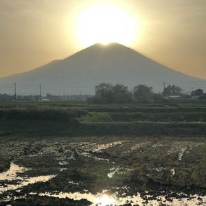 一昨日の夕陽のダイヤモンド富士,犬,誰⁉️ (2025.5.15 17;41〜御殿場アウトレットより) ※今日は雨で富士山は見えません