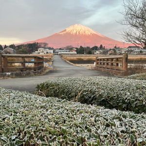 今朝の赤富士と橋と、霜が降りた茶畑の葉 (2024012.11, 6;48〜御殿場市,小山町より)