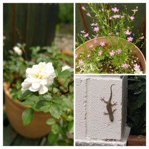 ☀️おはようございます😃 朝から晴れて暑さの予感がします😅 ①②③今咲いているお花をコラージュしました ④は西洋ヒヨドリの雄 朝5時前からさえずっています 私はその鳴き声で目覚めます 雌は出窓の屋根に巣を造り子育てしています ⑤夜9時頃になるとやって来るヤモリ君 『家守』と書いて縁起が良いとか金運もアップするとか いい事あると嬉しいですね😘 手足の動きが何とも可愛いですよ (本当は爬虫類は苦手なんですが不透明のガラス越しの為観察しています)