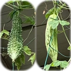 ゴーヤ2種 右サラダゴーヤ 左普通のゴーヤ ゴーヤ今年はもう終わりです。 もう高いところにしかならないので、収穫には脚立が必要です。 サラダゴーヤは、皮が柔らかくて苦味が少ないので、生でいけます❗️ 暑い時はゴーヤ、美味しいけど、寒い時は美味しく感じない。暑いところの野菜は、夏食べるのが正解で、体が求めるのかな。