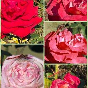 こんにちは♪ 薔薇の花に赤トンボが止まってます見つけてね ↖️イングリッド・バーグマン ↙️カリフォルニア・ドリーミング ↗️レオニダス ➡️レディ・メイアン? ↘️ダブル・ディライト 真っ赤なトンボで🌹真っ赤な火曜日