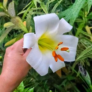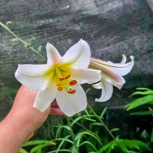 ハカタユリ Lilium brownii var. viridulum ①②2025/06/05 9:00 ③ 2025/06/05 13:00 ④ 2025/06/05 16:00 ⑤ 2025/06/06 7:00 日本ではほとんど見ることができない貴重なユリが開花しました😍😍 ハカタユリは咲き始めは黄色ですが、白色に花色が変化するのが大きな特徴です! 葉が2枚の小苗から3年かけてようやく開花してくれたので超嬉しいです😆😆 ハカタユリと名前が付いていますが、中国原産のユリです。16世紀後半に博多港に持ち込まれたことからハカタユリと名付けられたようです。 丁度、休日に開花したので花色の変化を細かく観察できました👍 恐らく個人宅での開花例は極僅かだと思います。 公共施設だと福岡市植物園での展示があると思います👍