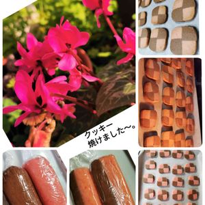 (。・ω・)ノ゙ コンバンワデス シクラメンさん (*´˘`*)♡キレイでした。 午前中に仕込んだ クッキー生地を 焼いたよ〜ん (焼く前は…ピンク色なのに…焼いたら…ピンクが…薄くなっちゃいました〜〜 ココア味〜🤭)