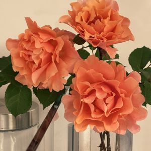 🌹サンセット・・・ ①サンセットメモリー 薄いオレンジ色の小輪つるバラ 咲き始めはコロンとしたカップ咲き 花付き、花持ちよく耐病性もあるので育て易いバラです ②サンセットグロウ ピンクがかったオレンジ色の中輪つるバラ 波状の花弁がひらひらと優雅な雰囲気 俯いて咲くので、目線以上の場所で咲いてくれると👌🏻 花持ちが良くないのがたまにきず🙄