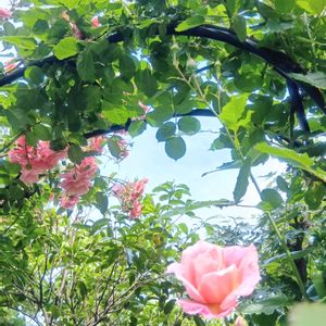 今日の庭バラ🌹 今年新しく購入したアーチ その② リビングを出てすぐのところに設置しました。 先に真ん中までたどり着いたアイヴァンホーめがけてサンセットグロウが建物側から向かってます。 いつになったら😚💕できるかな😁