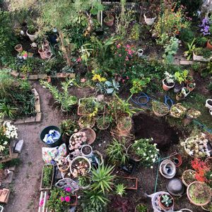 庭の中央部 休みごとに少しずついろいろ植えて楽しんでます。雑然としてます💦