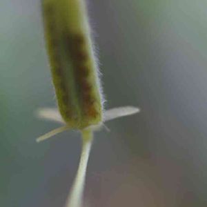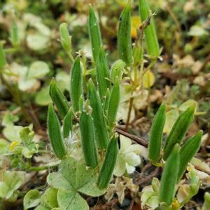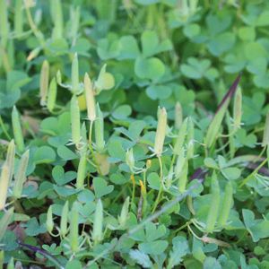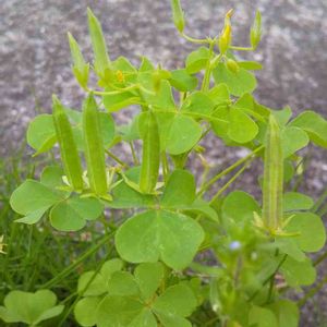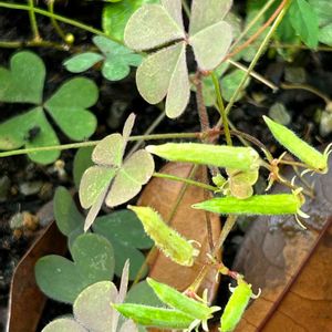 ムラサキカタバミのさく果 (写真手前) オクラのようなカタバミの実 写真撮ろうと手が当たっただけでバチバチ弾け飛びます‼️ 飛び出る勢いが凄い… 興味のある方は動画サイトで 『カタバミ 種』で検索を👍