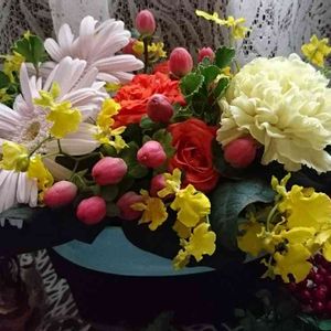 ✲゚*•(*・ω・*).•*¨* ✲゚おはようございます❣ 🌹🌺🌻🌼❁ 気持ちのいい早朝の涼しさ~~ あっとゆうまに気温上昇🔆 ̨ ̨ ₍⌯́⌓⌯̀ ₎💧 昨晩、娘が箱に入れられたお花を貰ってきて、母にまかすわ~~と渡され、ヒペリカム、オンシジウムを加えて飾ってみました🍀 (* ˘͈ ᵕ ˘͈ *)✾イイカンジ~❤️