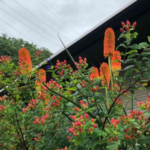 こんにちは スッキリしない空 時折ザーッと降る雨 そんな中でヒペリカムとコラボ トリトマ 雨の重さで他のところのものはみんな倒れてました😅 蕾の時が一番綺麗かな オレンジで統一されていて🥰 お花は黄色です 下から咲いていきます 筒状のお花でたくさん集まってこのようになってます 不思議なお花💕💕💕