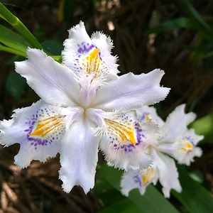 ヒメシャガ 仕事から帰ってきたらお花がたくさん咲いていた。 地面から15cm位かな。小さいのに花びらの中に細かい模様もあって、精巧なミニチュアみたい。
