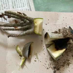 お腐れ様は突然に… 半分だけ様子がおかしいと思ったらやっぱりお腐れ様のご降臨でした。 なおちゃんに色々とアドバイスを貰って黒いところが無くなるまで切りました。 あんなに大きかったけど、ちょこんと手のひらサイズに。 ルートンつけて日陰で養生中だけど…助かるといいな😣
